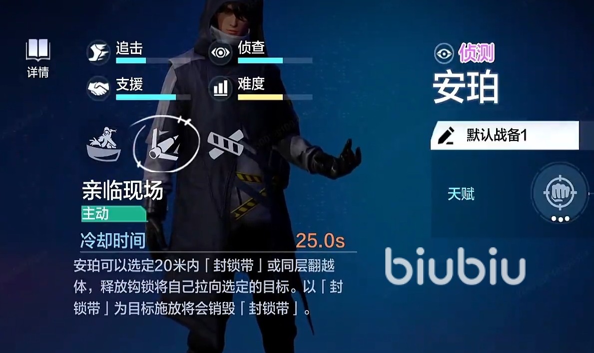亲临现场,冷却时间25秒,效果为角色可以指定以自身为中心,20米范围内任一个封锁带或者同楼层的翻越体,释放钩索将自己拉向选定目标,以封锁带为目标,释放则会销毁封锁带。非常强大的位移技能,可以配合一技能的封锁带,实施一个快速的场景转移,或者直接勾翻越体来进行快速移动,追捕敌人非常好用。