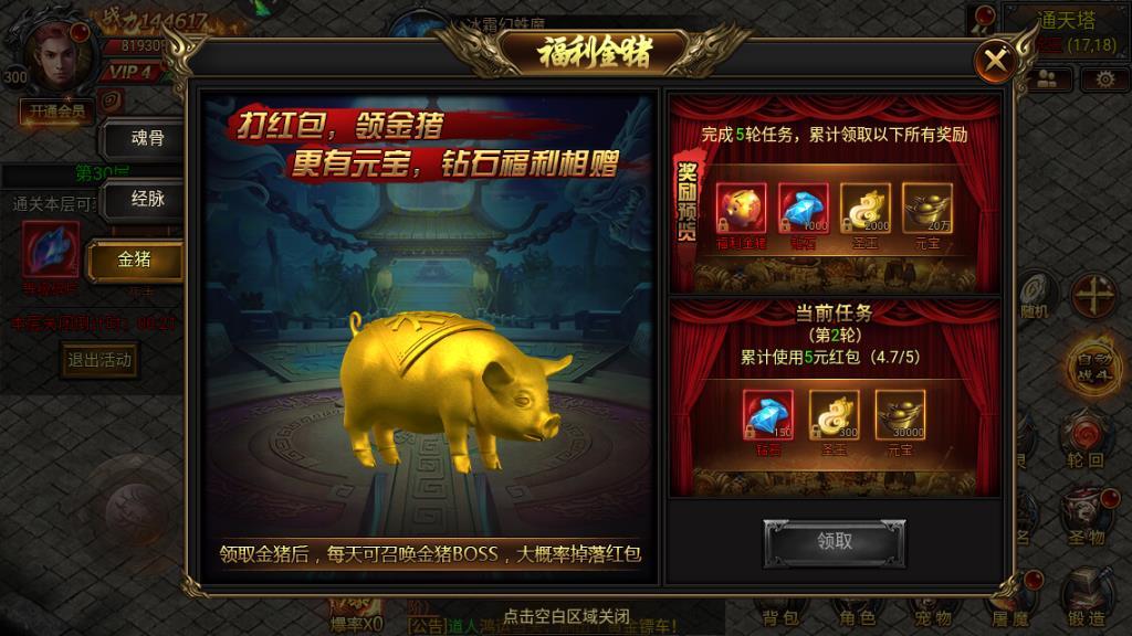 前往方式:伏魔殿的开启时间为13点和18点,每次开启时间为半个小时,在这半个小时之内,玩家可以自由的进入。每次进入会消耗两千元宝,大家可以通过回收装备来获取。在进入地图之后,还想需要玩家进行正确的道路选择才可以来到伏魔殿。