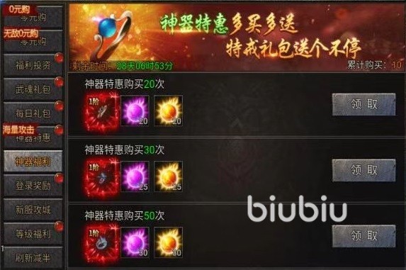 虽然神器也是百分比属性加成,但是后期的属性并没有武魂提升的多,而且进入地图不会受到神器方面的限制,而会受到武魂的限制,所以武魂要比神器优先级更高。在游戏中还有一个战力很关键的方面,容易被大家忽视,那就是4个特戒属性,这4个特戒分别是麻痹戒指,冰冻戒指,复活戒指和鞭策戒指,这4个戒指都是有着特定的属性。大家一定要尽快凑齐这4个戒指,然后看个人需求,可以去选择性的购买神器礼包,在达到相应购买次数之后,就去神器福利里面领取。