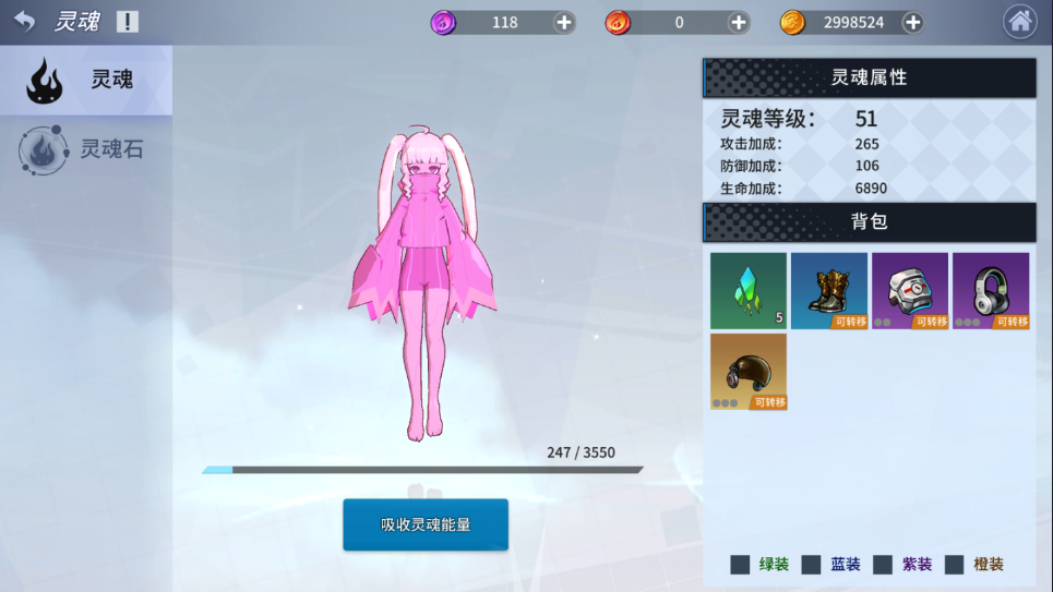 (1)灵魂升级:灵魂可以吸收装备和灵魂晶体蕴含的能量来提升等级;吸收蓝色以上装备可以额外获得:装备强化材料;
