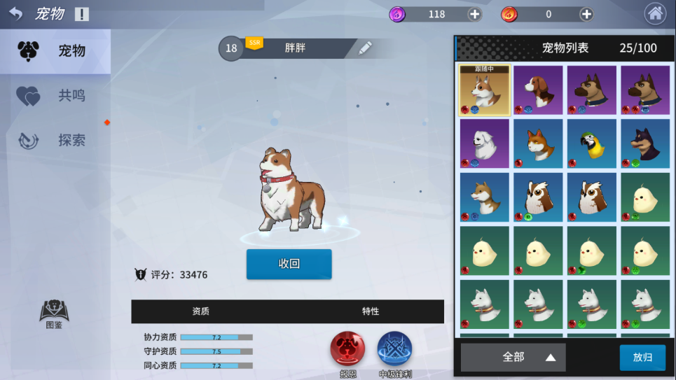 (2)培养:消耗宠物精华,提升宠物共鸣水品等级和基础属性。