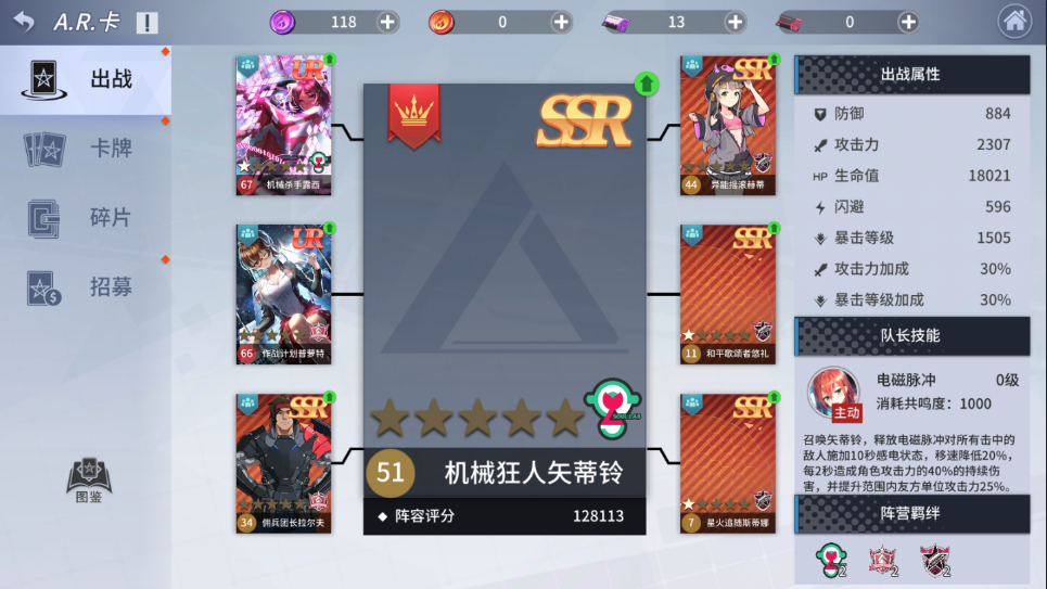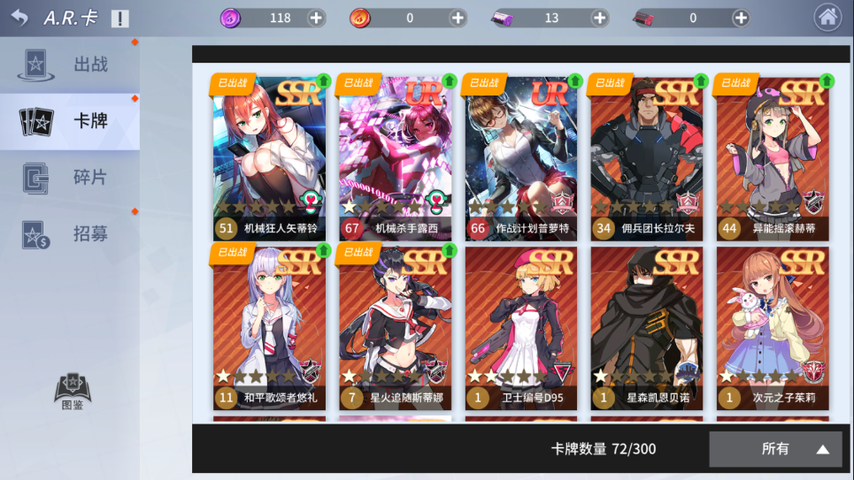 (3)卡牌突破:重复的A.R.卡获取后会自动转换成碎片;突破需要消耗一定数量的同名卡牌碎片;突破可以提升基础属性外,还可以提升队长卡技能等级和提升队员卡属性加成;低于SS R稀有度的卡,可以通过升星来提升稀有度,提升稀有度会解锁副属性,突破至SSR后可解锁属性加成效果。