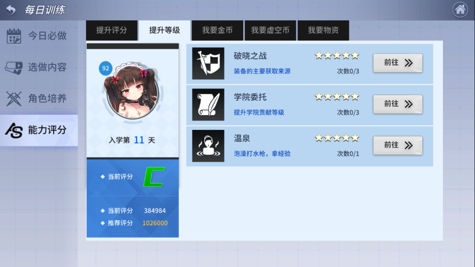 (1)提升等级:破晓之战(装备的主要获取来源)、学院委托(提升学院贡献等级)、温泉(泡澡打水枪,拿经验)。