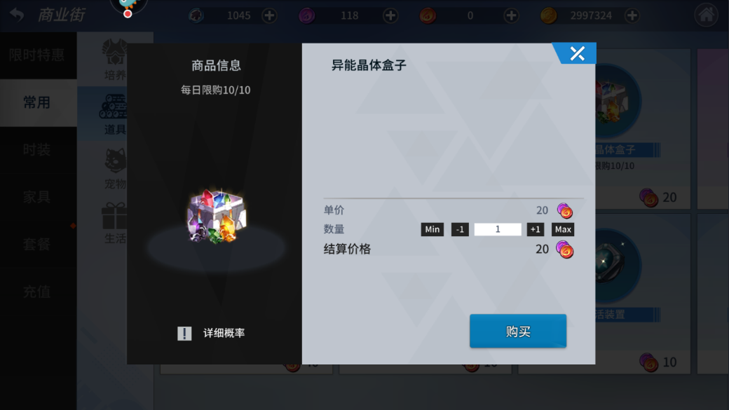 (2)商业街—道具:20虚空币(充值道具)可以购买一个异能晶体盒子,这个箱子中绿色异能晶体25%、蓝色异能晶体25%、红色异能晶体25%、黄色异能晶体15%、黑色异能晶体10%。