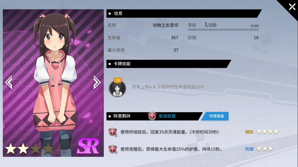 (3)动物之友雪华:所有上阵A.R.卡提供的生命值增加10%。生命值367、最大攻击37、防御18。
