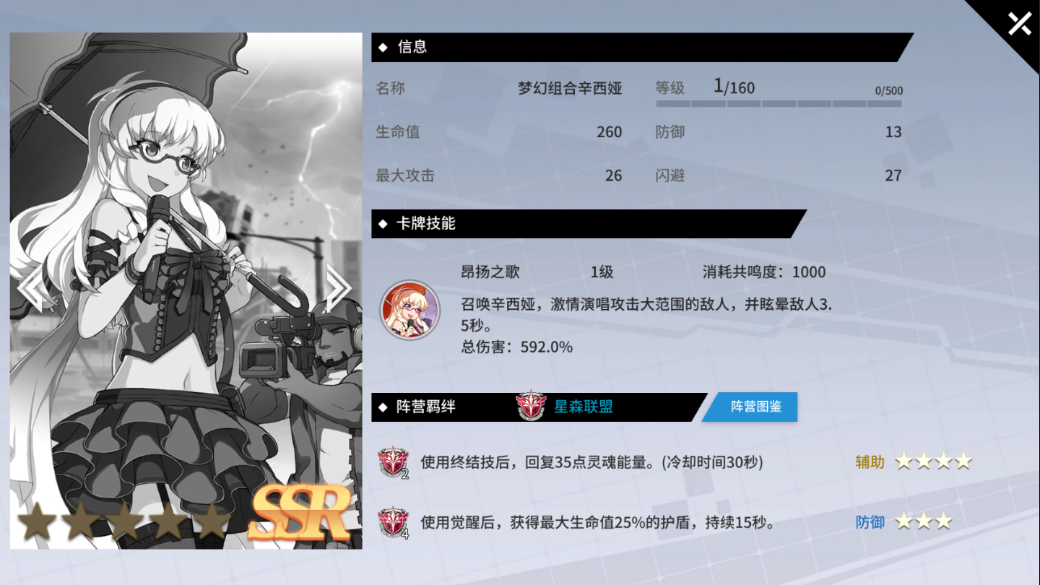 (2)次元之子茱莉:所有上阵A.R.卡提供的生命值增加11%。生命值632、最大攻击60、防御30、闪避59。