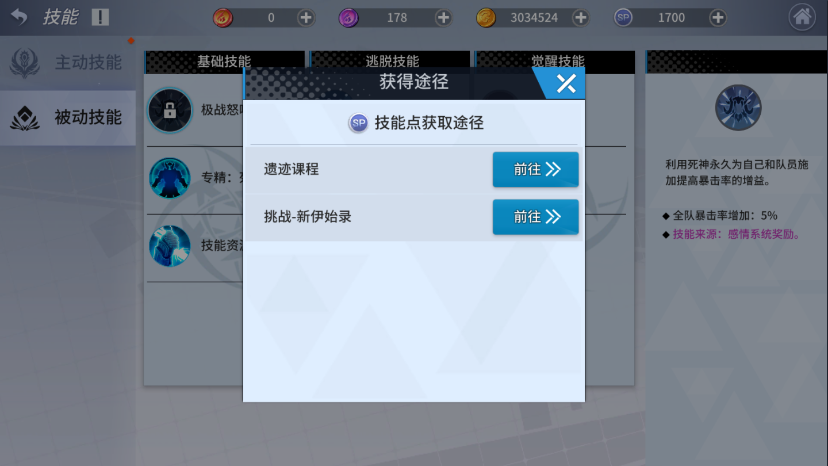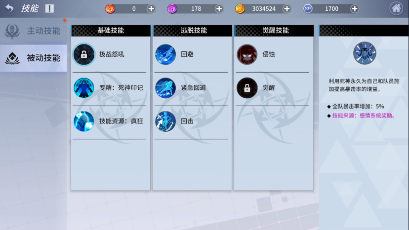(4)被动技能:虽然被动技能也非常的重要,但是这个缺急不得,这个不是玩家自己手动学习的,这个需要玩家达成指定条件才能解锁的,大家可以点击被动技能自行查看。