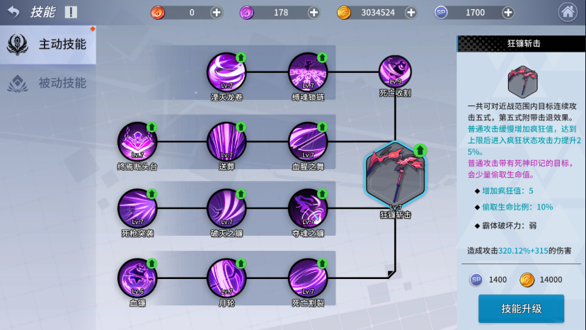 1、狂镰斩击:一共可对近战范围内目标连续攻击五式,第五式附带击退效果。普通攻击缓慢增加疯狂值,达到上限后进入疯狂状态攻击力提升25%。普通攻击带有死神印记的目标,会少量偷取生命值。