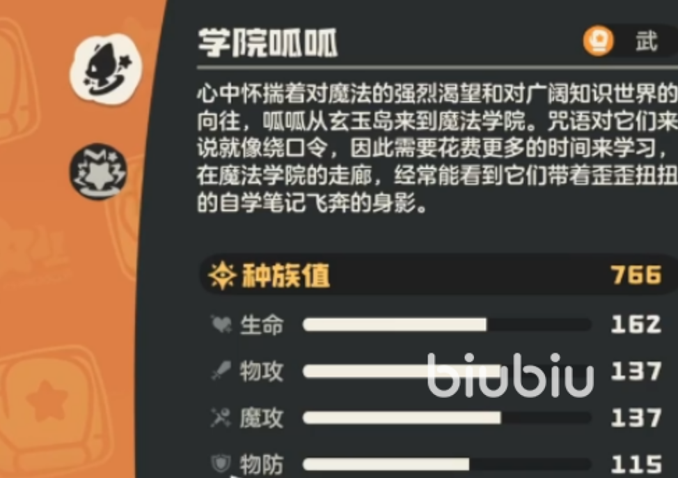 学院呱呱的属性分布是多面手,生命值、物理攻击、魔法攻击三项能力在版本中排在前面,兼具防御与输出的双重职能,其物理防御和魔法防御皆处于适中水平,在普通攻击面前具有防护效果。专属被动技能“留学生”对战斗有着非常大的影响。它每次使用技能都要消耗2点能量,这样的设计使得能量的管理成为玩家操作的一个重要因素。但是它的优势也十分明显,几乎可以学习所有的攻击类技能,技能池非常广。这就意味着玩家可以依照自身的需求来自由地选择技能组合,但是前提是要合理地安排好能量的使用,不能在关键时刻因为能量不足而陷入困境。
