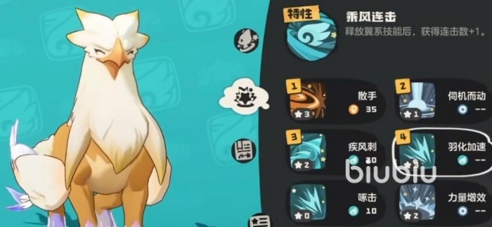然后就是关键的配招了,以最终形态的皇家狮鹫为例,是草系加翼系双属性,三维很高,性格这一块建议是加速度的“迅捷”,能在不消耗回合的同时增加连击和技能威力。常用的技能配招一般是伺机而动、散手、疾风刺、羽化加速,这四个是必要的,这样就能在对方聚能或者防御的是切换出来,同时连击和威力大幅提升,瞬间压制。