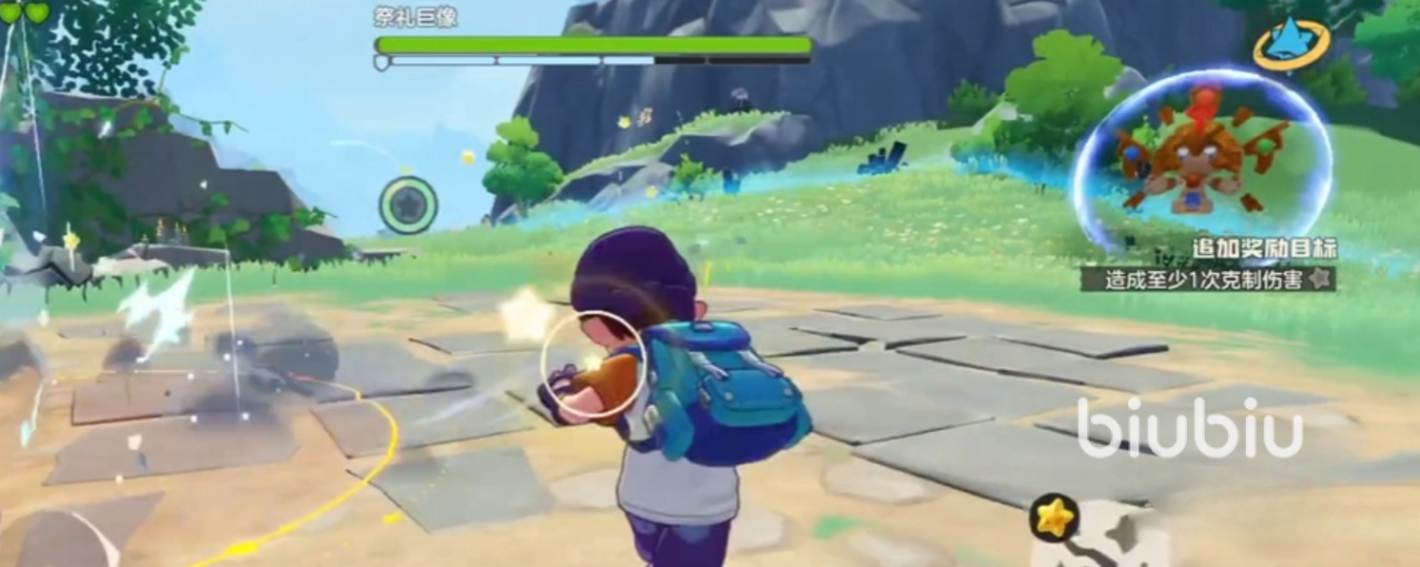 挑战祭礼巨像的第1个阶段要小心地面攻击,会立刻在脚下召唤出一排尖锐的刺,保持远距离作战是避免受到伤害的安全方法。同时巨像会召唤追踪光波,对玩家造成持续伤害,注意观察地面红色预警区及时躲避。在第二阶段中战斗环境有双重属性,地面有两个不同的属性。这时携带属性克制的宠物参战会事半功倍,可以更好地破除巨像的防御。