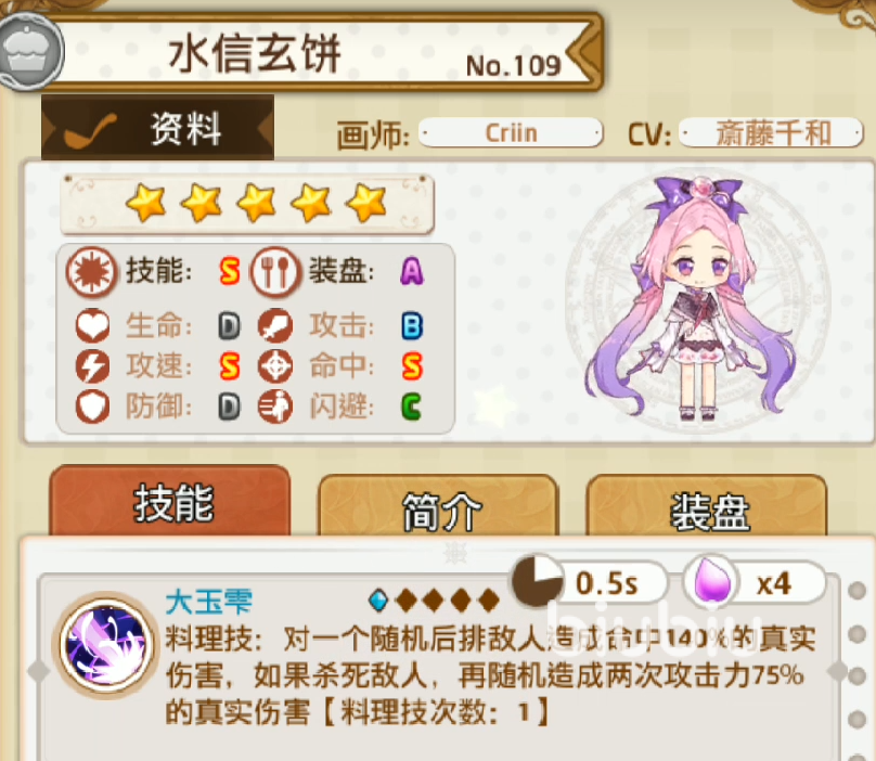 水信玄饼本身的生命和防御都是D,闪避能力则是C,攻击力为B,命中和攻速都是S。这个基础属性在甜点里面不算低了。尤其是命中和攻速都是S,在甜点之中也不算很常见,这也是水信玄饼输出强大的保障基础。