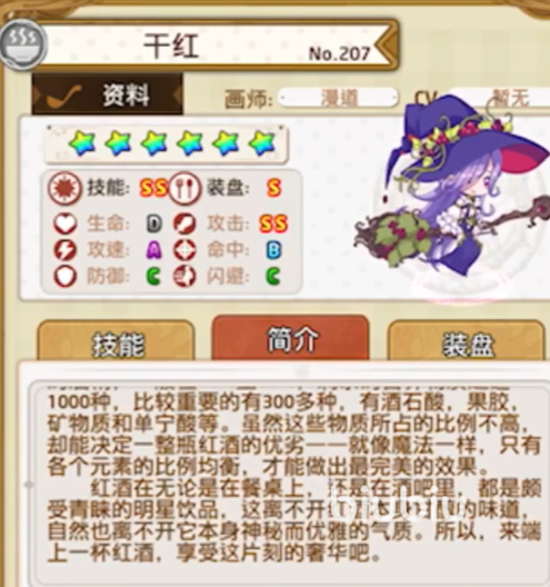 法国干红在游戏中的定位是汤饮,那么这也就说明了她必然拥有着较高的输出能力和较低的其他数值。在法国干红的属性面板中,攻击力能够达到1007左右,评分为少见的SS级别,攻击速度为831,评为A级。同时她的暴击和爆伤数值都非常不错,在输出方面绝对能够给玩家们带来惊喜。但她的生命、防御、闪避都仅仅只有C级的评分,命中值也只有831,只能达到B级。拥有穿刺效果的法国干红可以无视敌人的护盾,减低免疫以及锁血效果的影响。但是这一穿刺伤害不能触发暴击。