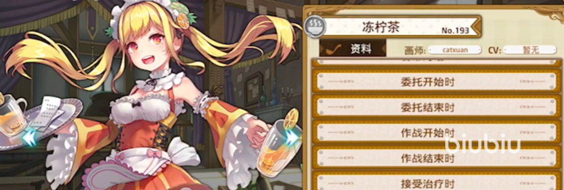 冻柠茶设计灵感来自于中国香港茶餐厅中的经典茶饮,她衣着中的黄色与橙色元素对应着冻柠茶自身酸甜的味道。在游戏中,冻柠茶的定位是汤饮食灵,也就是玩家们俗称的后排输出角色。所以在冻柠茶的属性面板中,玩家们可以轻松的发现他的攻击力和命中值都能够达到S的评分,同时生命板块也是所有汤饮食灵中少有的S。但是与高额伤害达到平衡的,是冻柠茶相对比较弱的防御、技能以及装盘,这也就意味着它的装盘会直接影响到配队中的主菜。攻速方面冻柠茶的屏评分只有C,所以需要更加依赖技能来对敌方造成伤害。
