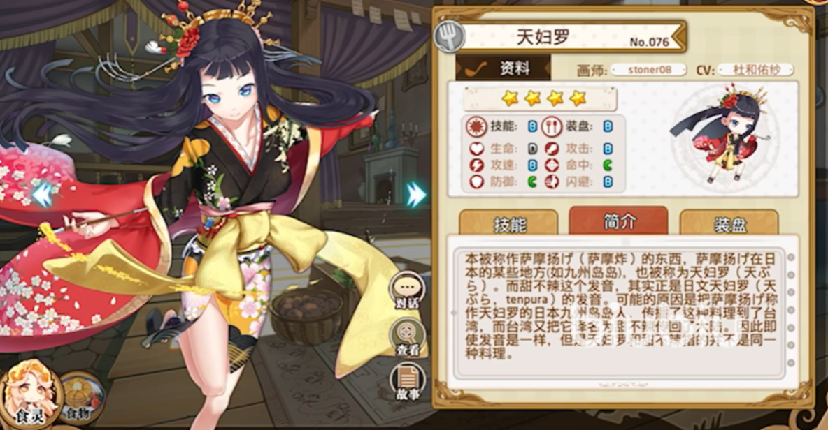 属性面板方面,天妇罗的各项数值虽然不突出,但好在平均。攻击力与闪避数值分别为392和759,可以达到B评分,生命值为2190,评分为D。攻速为5,评分也为B。天妇罗的身板较脆,但可以依靠不错的闪避数值提升自己的生存能力。技能和装盘的评分都为B,这也足以证明天妇罗作为一名四星级角色的强力之处。也因为前文中提到天妇罗的获取难度很低,所以玩家们可以在前期就组建起一个相对完整好用的阵容,天妇罗自身能够提供的增伤效果也可以弥补前期队伍容易出现的C位攻击力低的问题。