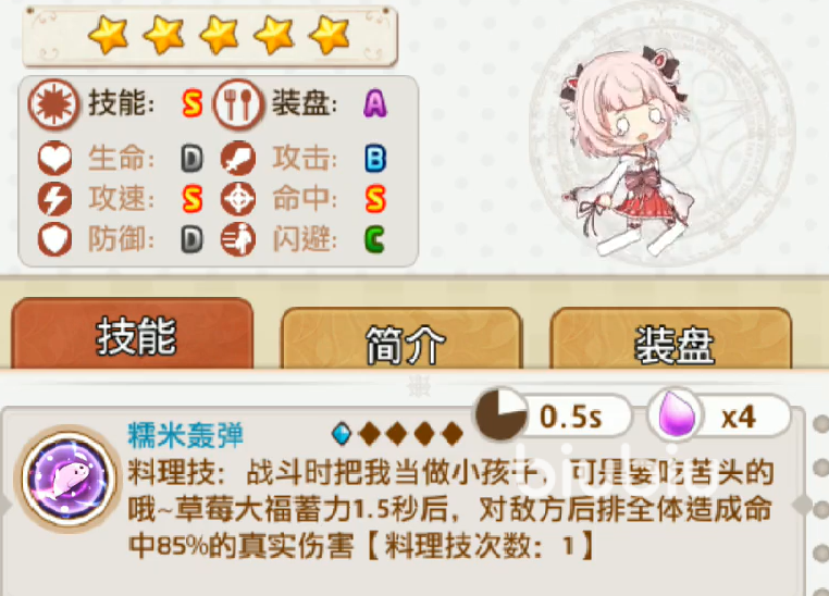 接下来我们便围绕着本次游戏重新开启所拥有的食灵来做出一个介绍,首先介绍的食灵是草莓大福,也是本次烹饪保底所给的食灵。这位草莓大福本身的实力很强,在玩家们的开荒之旅中担任很重要的地位,接下来我们先介绍她的属性,生命,防御和闪避都是比较低的,分别是两个D一个C。攻击在甜点之中不算弱的,拥有B级,命中的话则是S级,而攻速也有着S级。这对于甜点的食灵来说属性是非常优秀了。接下来来介绍她的技能。