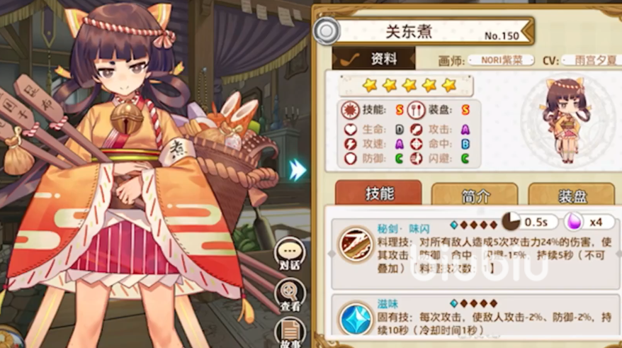 关东煮,可以通过烹饪获取,攻击和攻速是她的优势,擅长群体输出,料理技是对所有敌人造成5段伤害,同时大幅降低敌人的攻防命闪。固有技,则是可以降低敌人的攻防,并且能叠5层。搭配沙拉酱可以在每次给敌人施加debuff的时候使其额外受伤提升,累计4层清空并造成一次眩晕。关东煮的在这个队伍中起到攻击辅的定位,能显著提升队伍的输出,也是比较百搭。