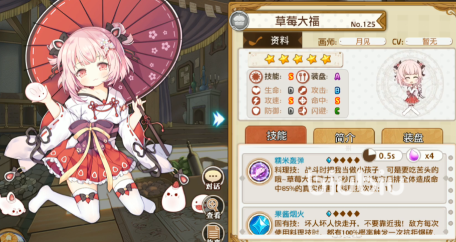 草莓大福,可以通过烹饪获取,目前活动保底也能抽到。草莓大福在攻速和命中这一块表现优秀。料理技短暂蓄力随后对敌方全体后排造成真实伤害。固有技则是敌方每使用一次料理技己方都会发动一次爆破对全体造成小幅真实伤害同时击退。搭配果子酱还可以叠命中,叠满8层每次造成伤害更有概率额外释放一次料理技。装备方面“像素”的效果是最好的,可以在敌方释放料理技的时候自身伤害提升,受伤降低,刚好契合草莓大福的固有技。