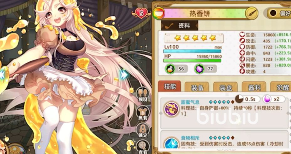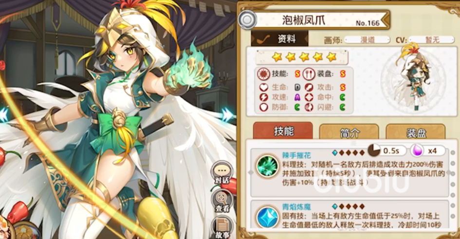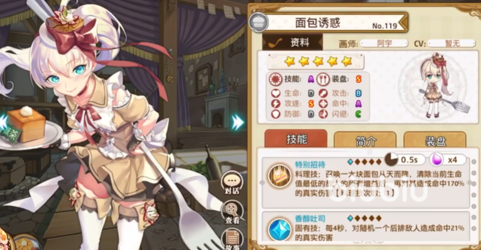 面包诱惑,抽奖活动中可以获取,并且会自动获取1个2觉,攻速和命中是该角色优势所在。料理技可以对随机后排敌人造成真伤,固有技则是每4秒随机后排伤害,搭配炼乳酱获得更多增伤,同时累计造成伤害达到一定值后还会额外一次料理技,残血的时候会清除所有的减益同时获得无敌并释放一次料理技。面包是主切敌方后排的角色,如果对面有脆皮的强力输出型后片用她来应对是很好的选择。自身也有残血无敌能续命,搭配上“御守”这件装备更是可以进一步提升生存。