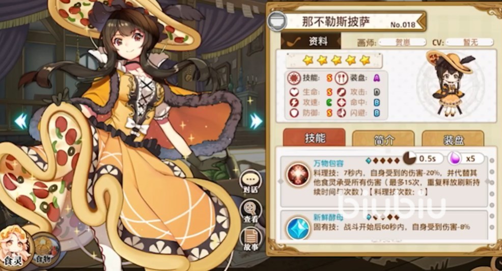 那不勒斯披萨,目前只可以通过烹饪获取,在血量和防御这一块非常突出,料理技可以在短时间内大幅降低自身受到的伤害同时代替其他角色承受所有伤害。固有技则是入战60秒内受伤降低。通过合理的装盘可以给其他角色提升增益,与至少3个角色相邻的时候可以让所有甜点的料理技能次数加1同时抽取几率提升25%。搭配XO酱还可以提升料理技、固有技的等级,同时有减伤增伤和闪避提升,能抗下超多的伤害。