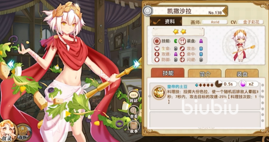 面包诱惑则是敌方后排单体特攻,能速切后排降低己方生存压力。甜甜圈则则是兼顾后排单体真伤与群体持续性真伤,觉醒后每次造成真伤还能叠命中,叠10层获得标记,叠6层时候就可以释放觉醒技能清除所有自身debuff同时给予敌方全体真伤与致盲,释放的时候甜甜圈还免疫控制。凯撒沙拉,2星头盘,实用性很强的角色,可以眩晕敌人并降低目标攻速,搭配沙拉酱控制更足。