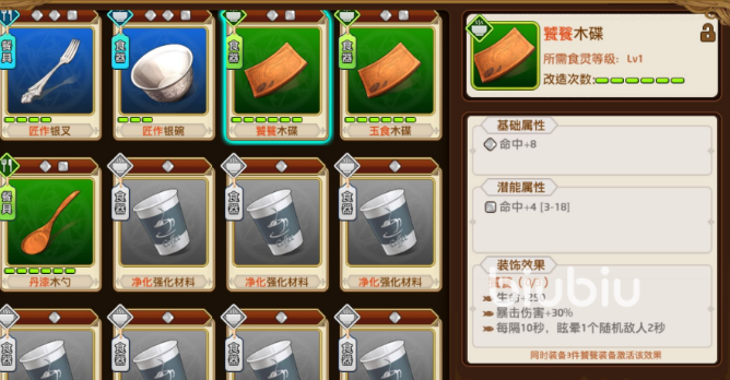 而高级紫装则不一样,它可以提供料理和固有各+1的等级。并且本身的特殊效果也比较多样,基本上效果都是和当期的食灵可以完全搭配,比如回响的效果就是需要和泡椒凤爪配合才能发挥出最大。