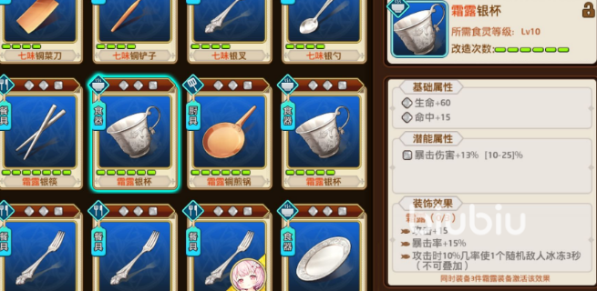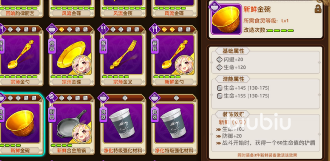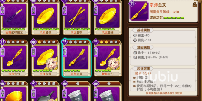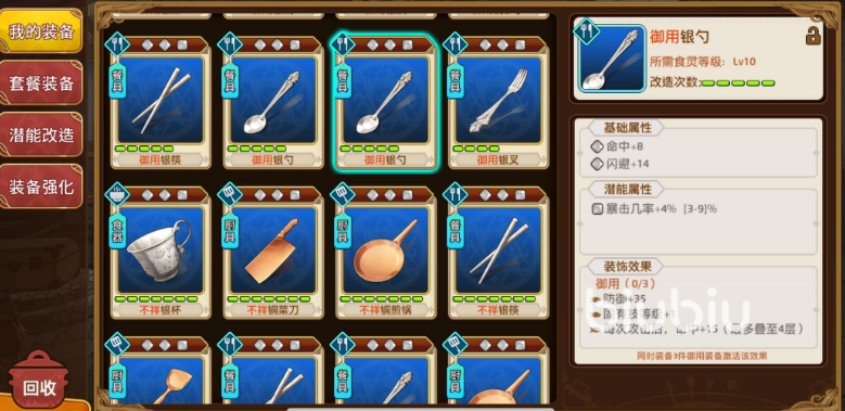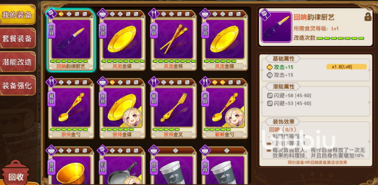 最后我们来介绍紫装,紫装的种类是最多的,它的效果也是最好的,有些食灵还有着近似于专属效果的紫装。目前的紫装被分为两种,一种是普通紫装,一种是高级紫装,普通紫装的样子绝大部分都一样,所给的套装效果最好也就给料理或者固有技能其中一个+1,特殊效果也是比较一般。