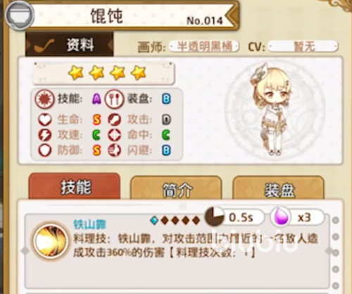 她的料理技是铁山靠,馄饨会对攻击范围最近的一名敌人发动攻击,本次的攻击会造成540%的攻击力。此技能并没有什么额外的属性。馄饨的装盘技可以让队伍的甜点的料理技次数增加2,但是重装时CD会增加2秒。