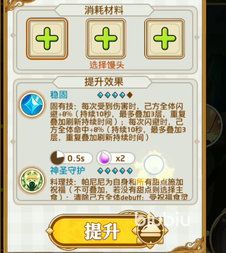她的料理技是神圣守护,在短暂的咏唱后会召唤守护阵,接下来一定时间内会让自身免疫控制,并且减少40%的伤害。帕尼尼的装盘是让所有的食灵在重装料理技的时候,CD会减少0.5秒,最低不能低于5秒。