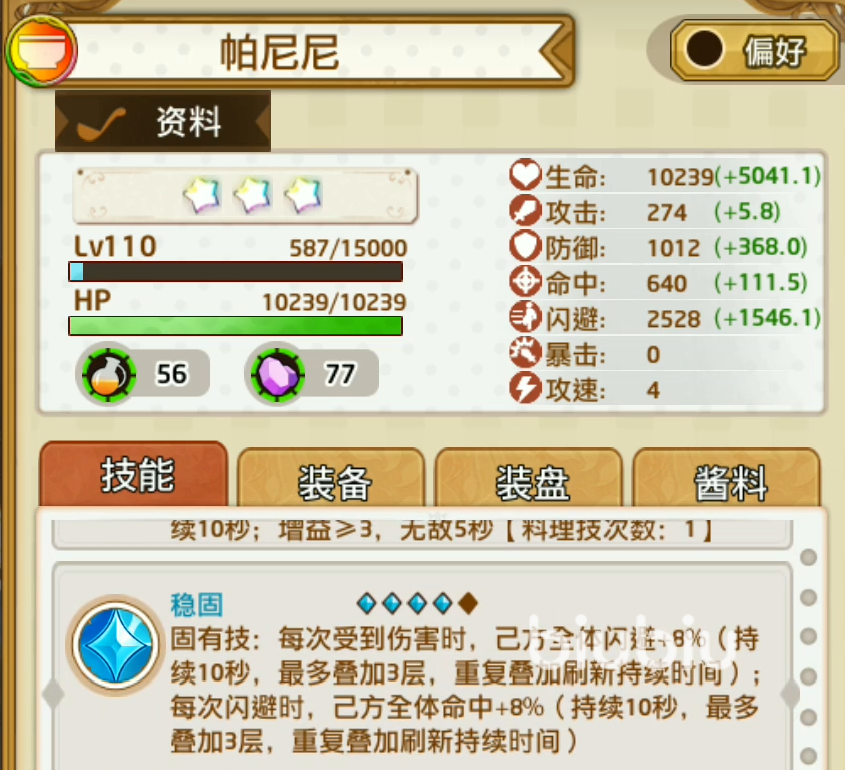 帕尼尼本身的属性在三星之中不算特别出彩,她的生命成长为A,防御成长是B,闪避成长也是A。因为是主食,所以她的攻击力不算高,只有D。命中和攻速只有C。总体来说这个属性对得起主食的定位。