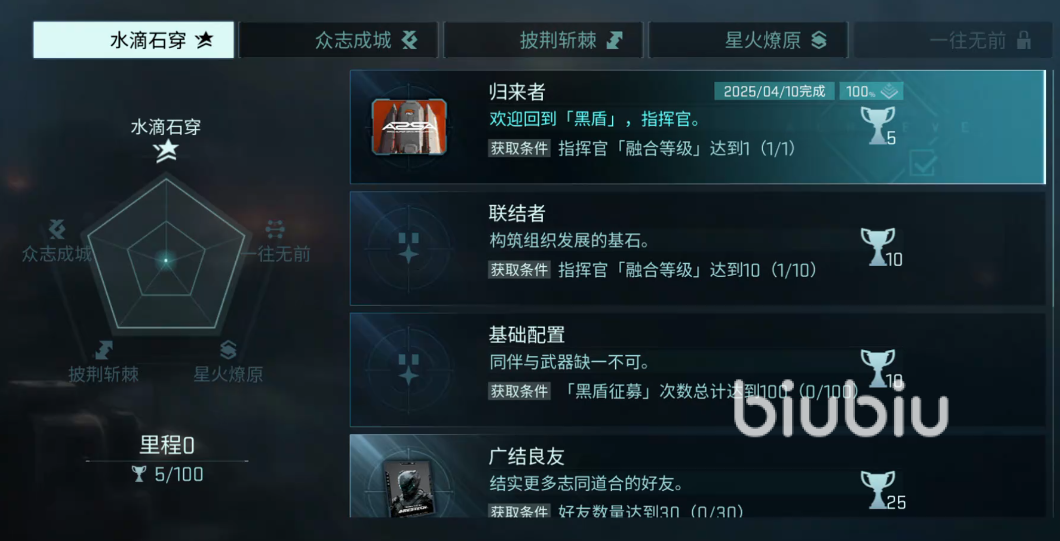 游戏中成就一共分为了5个板块,分别是水滴石穿、众志成城、披荆斩棘、星火燎原、一往无前。就以水滴石穿为例,在解锁的条件上不一致,有些是要求玩家提升指挥官的等级到一定级数,有些是玩家累计抽卡的次数,还有一些是和玩家的结交的游戏好友数量有关。