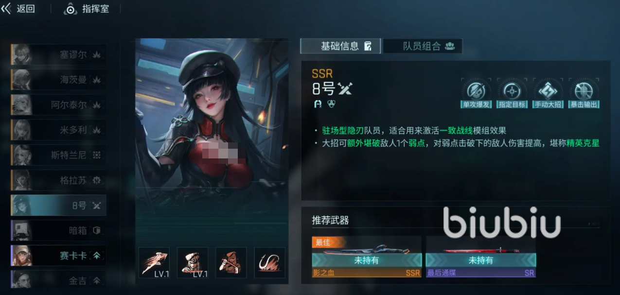 以瞬发爆发著称,部署后立即释放大招,并在技能结束后迅速撤离战场。“打完就走”的作战模式让隐刃成为专杀高威胁目标的利器,尤其擅长刺杀敌方后排或关键精英单位。由于部署费用低、出手速度快,隐刃可随时突入敌阵制造混乱,但是再部署时间长,所以每次出击都必须经过精密计算。