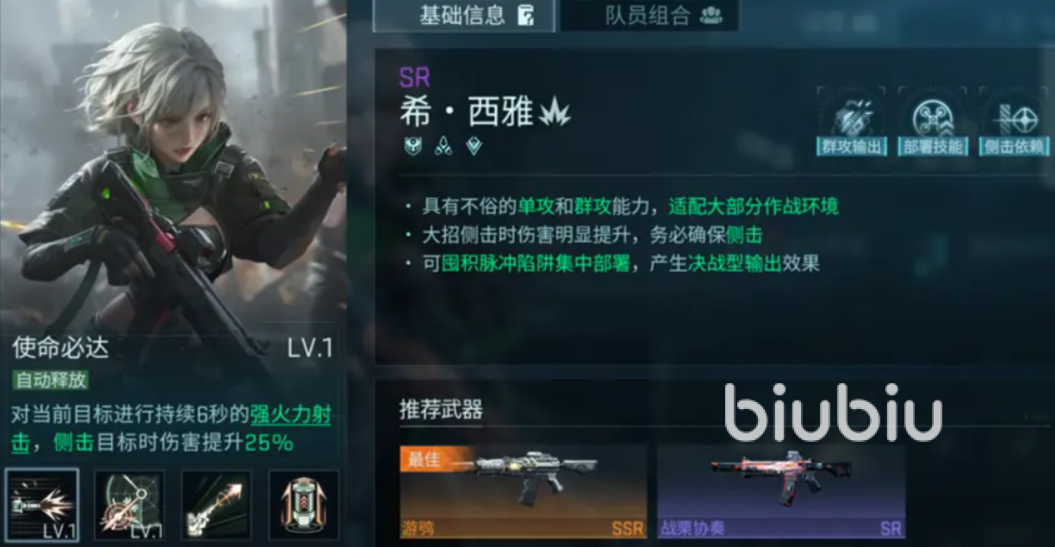 西雅初始就能获取拥有,同时拥有对群和对单的能力,她的“使命必达”会对当前的目标敌人打出6秒扫射,如果攻击侧击敌人本次的伤害会提高25%,她的“脉冲陷阱”可以在能量满的时候,拿到一个能部署的陷阱,该陷阱在部署之后会攻击范围内所有敌人,对他们形成伤害;
