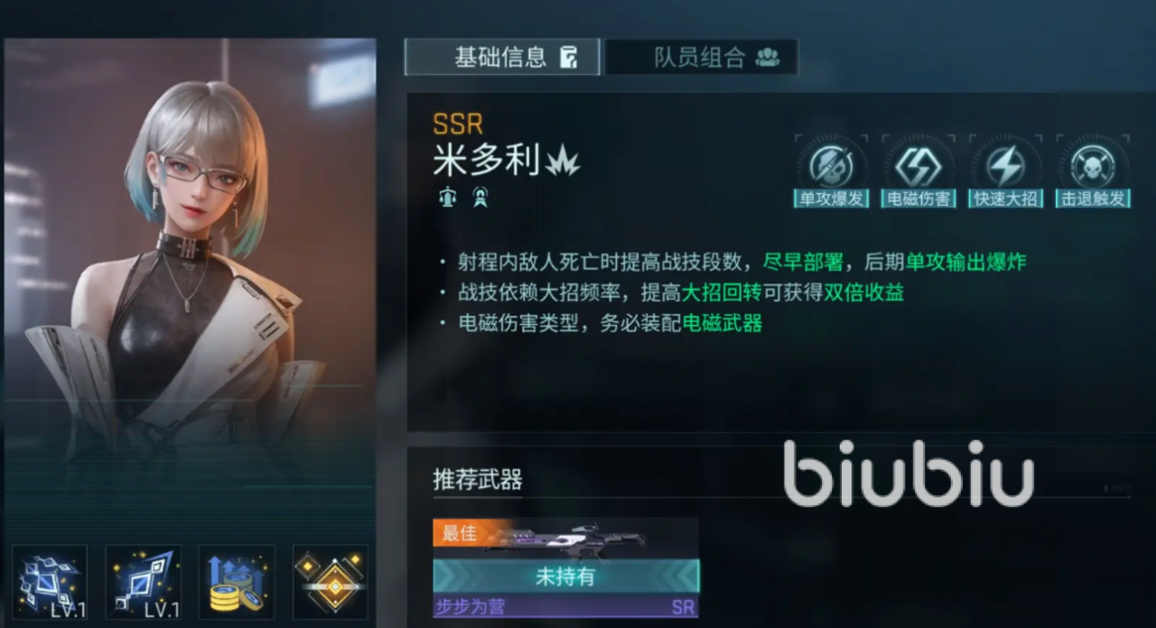 米多利属于电磁伤害类型,建议装配电磁武器,她能在射程内有敌人死亡的时候提升战技的段数,尽早对其进行部署,能让她后期的单攻伤害爆炸,不过她的战技会比较依赖大招的频率,注意提供大招的回转来获得双倍收益。