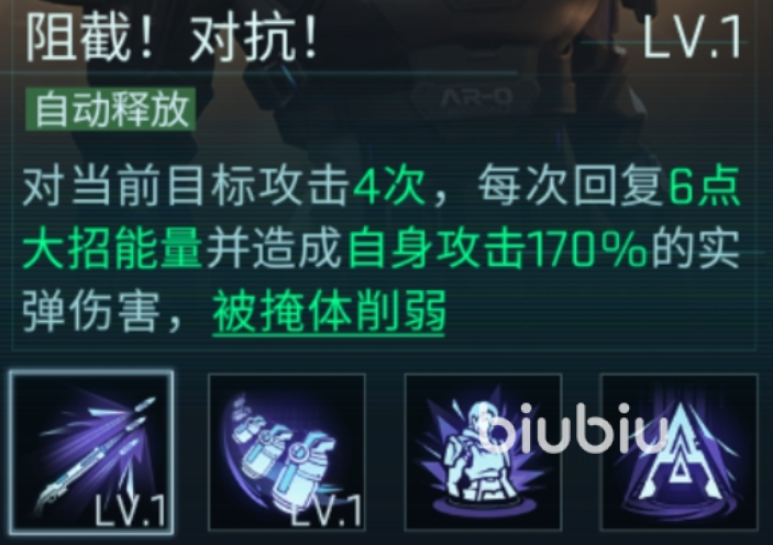 技能“阻截!对抗!”,对当前目标进行四次射击,每次造成自身攻击170%的实弹伤害,并回复6点大招能量。虽然会被掩体削弱,但凭借攻击频率和能量回转,她能快速积攒大招,使作战节奏保持在持续输出状态。