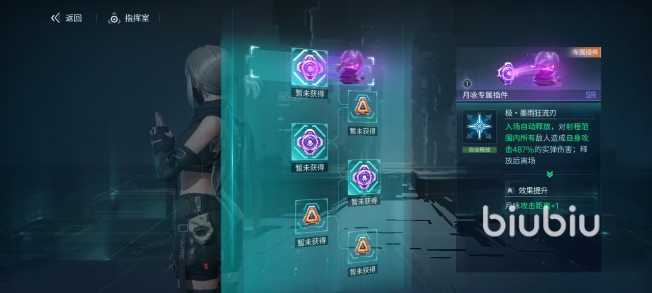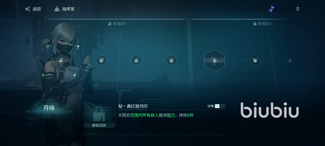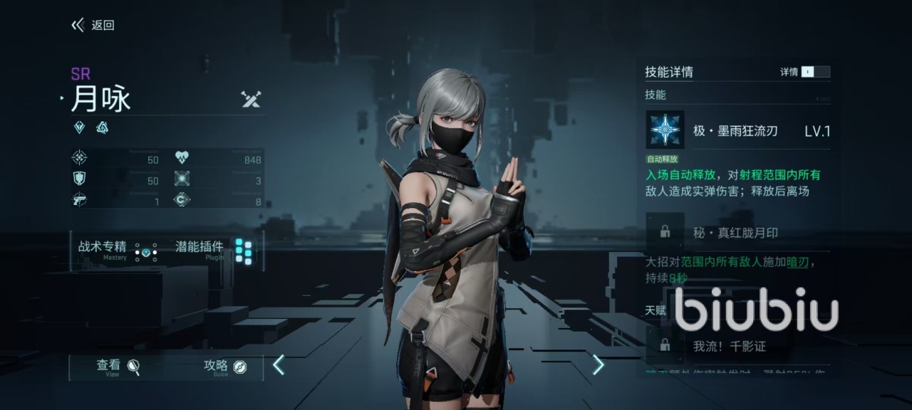 除了主动技能之外,还有两个被动,所提升的都是暗刃效果。当暗刃额外伤害触发时,还会触发溅射,直接伤害到其他被施加暗刃的敌人,暗刃的额外伤害触发几率获得提升,触发间隔缩短。月咏是属于群攻隐刃队员,在部署的时候应该尽可能的覆盖更多敌人。月咏对攻击过敌人会施加暗刃,队友的普攻或者是刀召唤单位,攻击都可以追加额外伤害,所以比较适合搭配侧击率高或者是能召唤单位的队友。