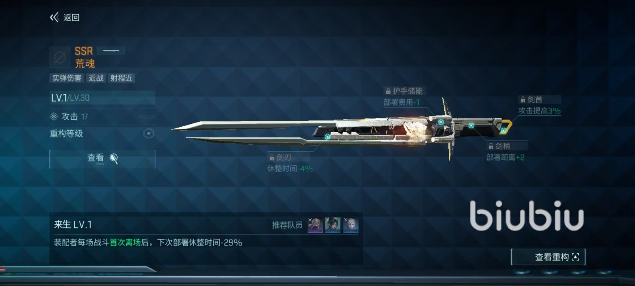 在武器方面推荐选择SSR品质的荒魂,这把武器的攻击距离比较近,特点是装配者每场战斗首次离场后,下一次部署的休整时间降低。如果暂时没有获得荒魂,也可以选择SR品质的境界,境界的技能效果是,装备者对每个目标的首次攻击,都能附加额外的电磁伤害。在阵容搭配方面,结合自身的技能效果,小编认为最适合配合的有以下几个,首先是召唤单位方面,包括梵妮、维希尔、格拉苏、金晶等。可以选择一些侧击辅助队友,例如夏帕特和赛卡卡,都是比较不错的选项。