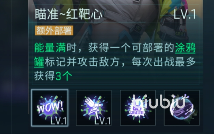 基础技能“瞄准~红靶心”能在能量满时生成一个可部署的涂鸦罐标记,最多三个。部署时不仅能攻击敌人,还会触发后续技能循环。“喷绘~绿兔子”是她的核心输出技,每次部署都会进行6次涂鸦射击,每次造成攻击237%的实弹伤害。多人集火状态下,通过技能“亿万大狂欢”,射击段数还能额外提升,每多两名参与集火的友方便增加一段,最多追加6段。