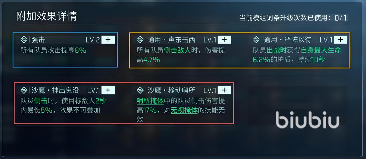 当增强模组之后就将会获得三层buff加层,第一种是不需要任何的抽奖和刷怪,全队就可解锁沙海守望者、游击掩护和游击防卫队三类增益效果,能够极大的提高掩体和攻击效果。第二种是获得声东击西、神出鬼没、移动哨所、强击和严阵以待等加成效果,可提高队友的6%强击和5%的内易伤,还能获得生命护盾。第三种就是队员获得额外的防御、攻击和生命值加成。