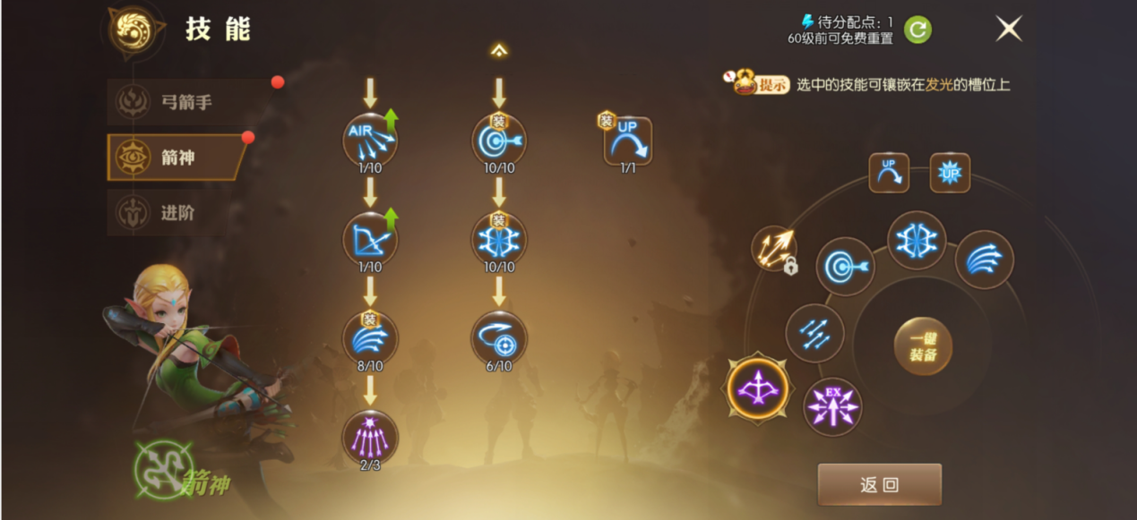 经过不断的权衡之后小编为大家介绍一下小编的带法,分别是集中射击-强化、神速射击、箭雨暴风、瞄准、迅捷箭、大招尽量携带箭术革命,因为这套技能大部分都是吃暗属性加成的,Buff技能与之前类似。