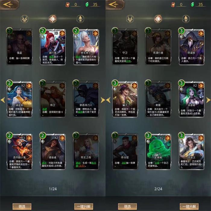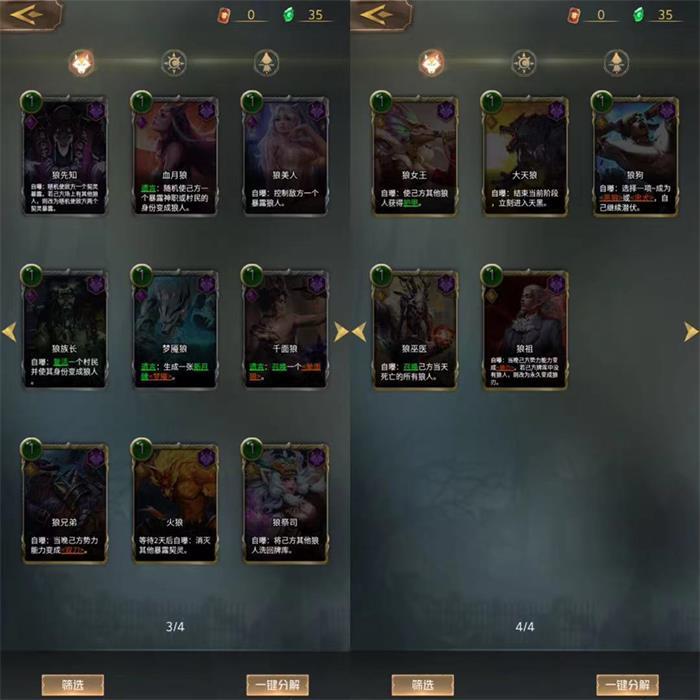狼人牌不同品质不同阵营所有牌共有五十六张,可以按需要搭配,狼人是游戏最重要的一部分,确保狼人存活才可以获得对决胜利。