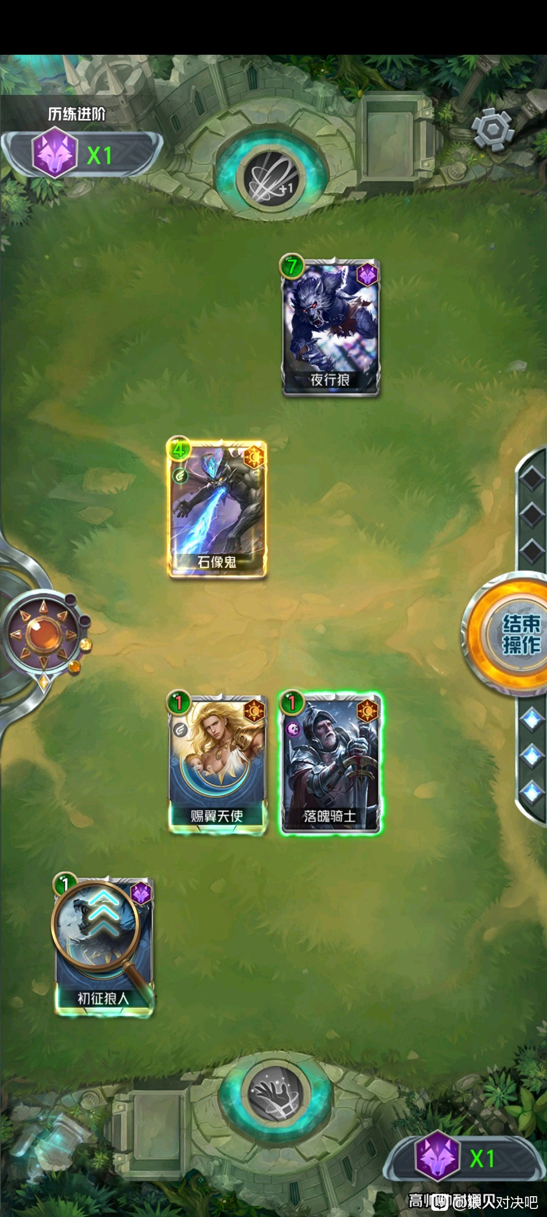 在卡牌的属性中有一类是属于飞行类的,普通卡牌是没有办法攻击飞行类的,需要有飞行的类的卡才可以击杀,这一关主要的核心就是理解这个内容,我们开局可以看到首先我方赐翼天使自爆对落魄骑士发动技能,赐翼天使可以给一个单位增加飞行属性,落魄骑士获得飞行对石像鬼发动攻击,紧接着我们使用赐翼天使对石像鬼发动攻击结束当天回合,到达晚上的时候我们使用狼刀斩杀狼即可通过挑战。