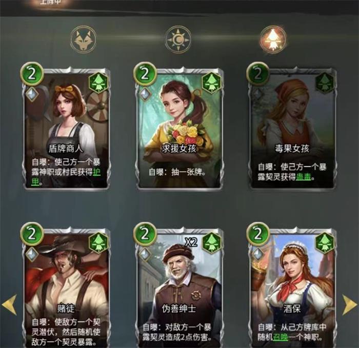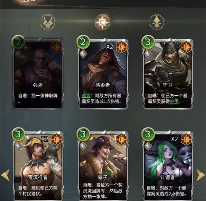 在卡牌上方的这三个标志依次是狼人、神牌、平民。中间的太阳的标志就是神牌的标志,右边的稻草人标志就是平民牌的标志,点击你想要查看的种类就可以了。