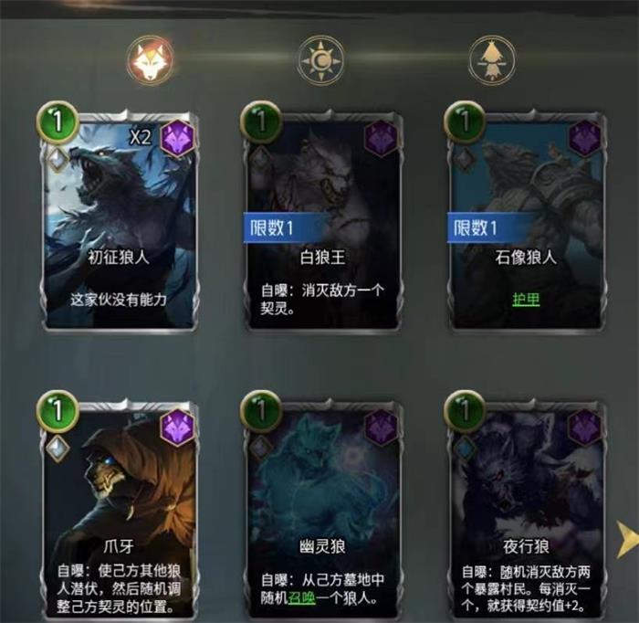 在卡牌的右上角就是这个卡牌的种类,就可以根据它去区分出哪个是神牌哪个是平民牌。左上角的数字则是契灵的血量,数字下面的菱形宝石是用来区分卡牌质量,分为白色、蓝色、紫色和橙色,橙色就是传说卡牌。下方的文字是契灵的技能描述,一套卡牌组中狼牌只能有四个,平民牌和神牌数量不限但总数不能超过24张。