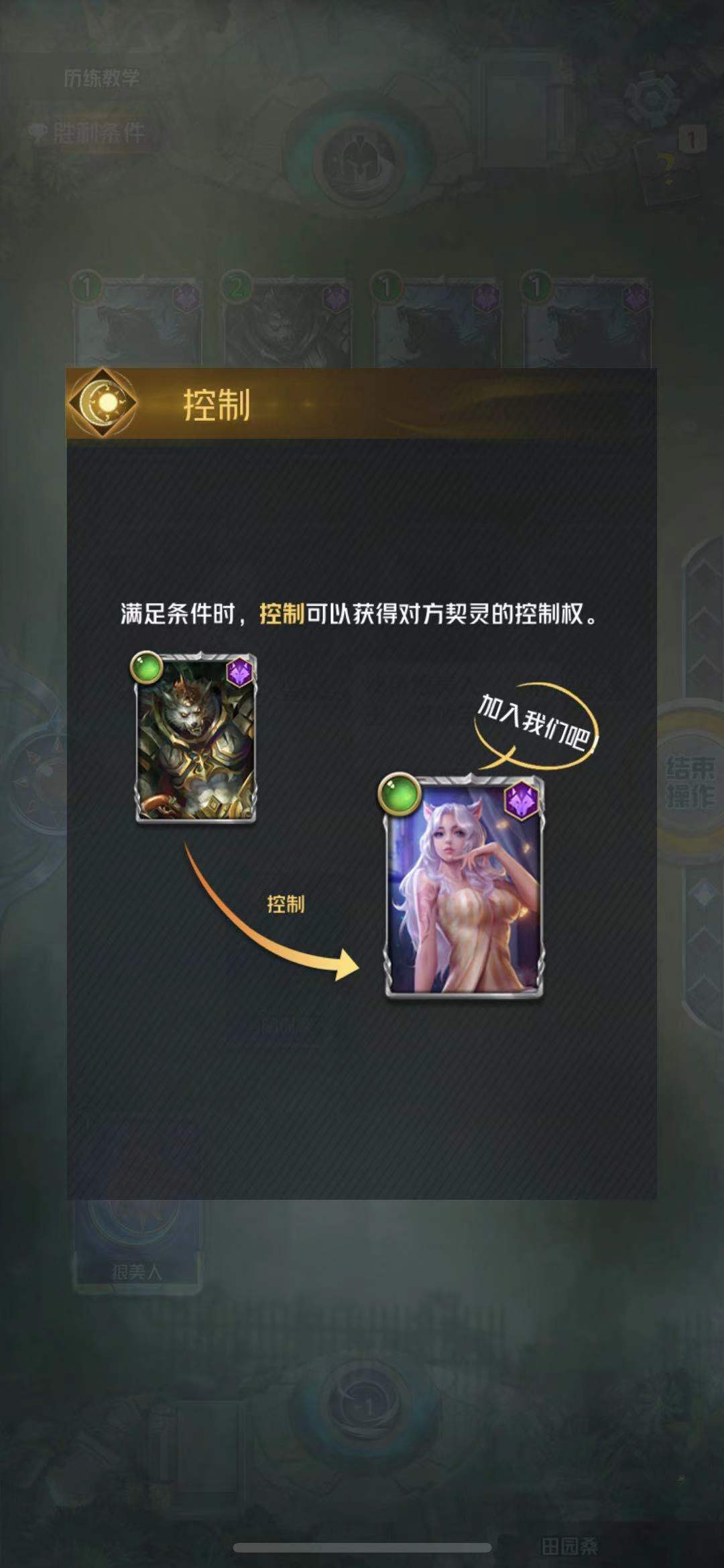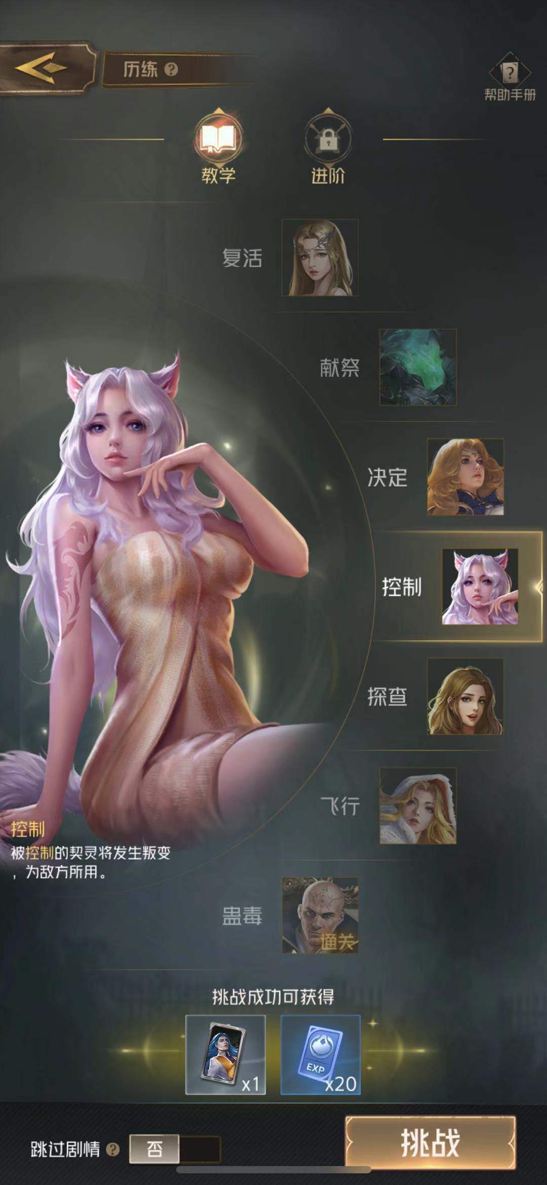 历练关卡是一类教学关卡,主要是来辅助玩家了解游戏内的各种机制的,而对于控制是游戏中比较特殊的机制,可以在对战的时候操控对手的契灵,有些角色具有魅惑能力可以在自曝以后控制对手,从而达到卡牌上的数量压制,迅速打出卡差,帮助卡组获得节奏上的优势。