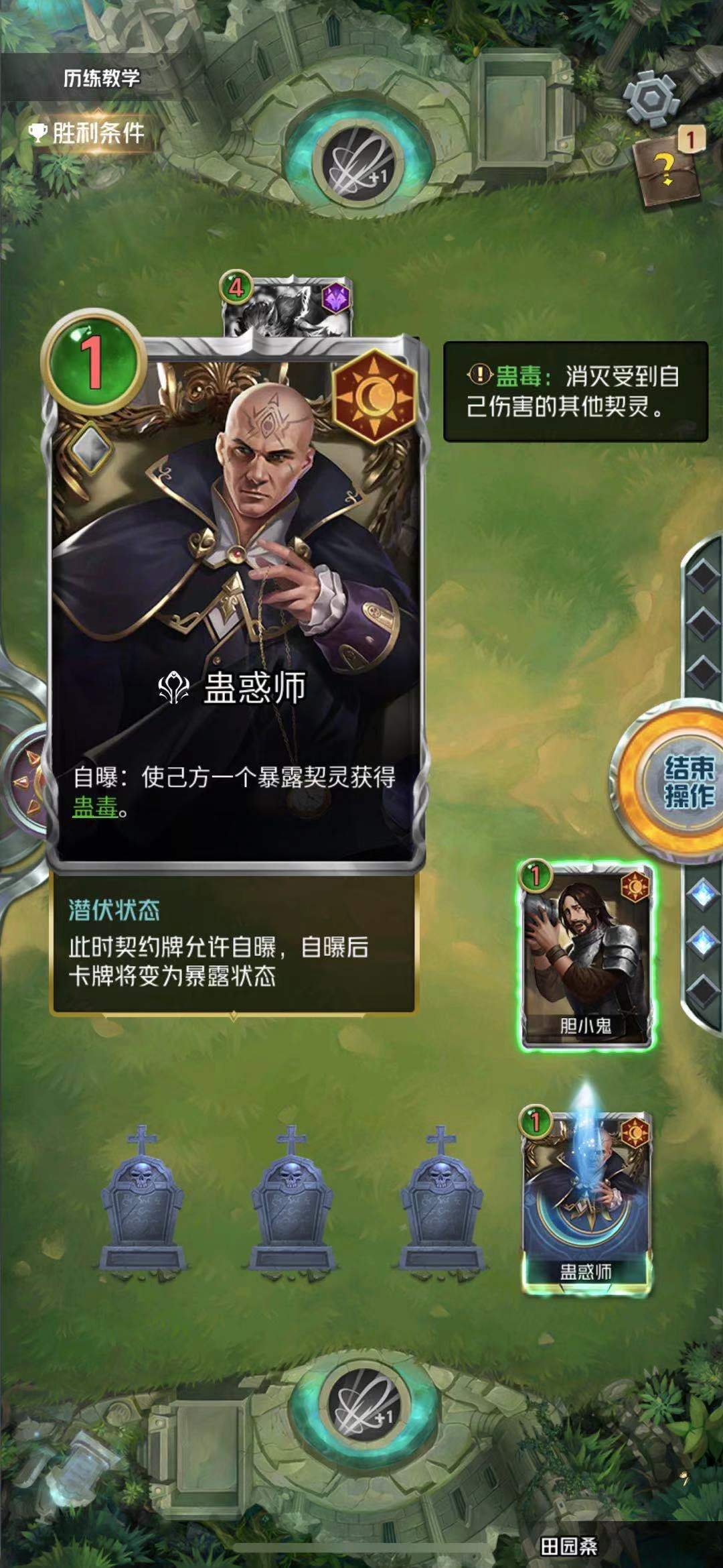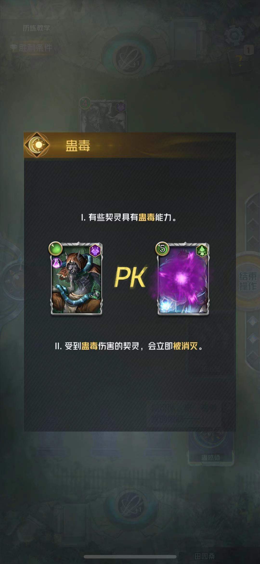 历练模式是用来学习和了解游戏内的各类的机制的,有很多游戏中常见的机制不了解的话会在游戏中表现的很被动,特别是一些特殊能力,蛊毒作为一种常见的机制它的作用是受到蛊毒的角色无论自身多少契约值攻击对手都可以直接消灭对手,这样的话就可以以极少的契约值卡牌去换大契约值的卡牌,理解这个特点蛊毒关卡就非常容易通过了。