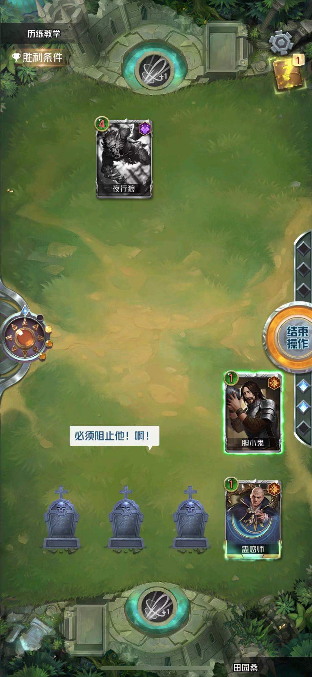 首先我们进入关卡一开场对手夜行狼就发动自曝,引发被动随机消灭我方两名卡牌,然后紧接着撞了我们的村长将其消灭,在这个状态下我方只剩下一个胆小鬼和一个蛊惑师,对方的夜行狼是4个契约值,而我放两位都只剩下1点契约值,硬打是肯定会输的,但是蛊惑师的技能在自曝后可以给一个暴露契灵活的蛊毒状态,这样的话我们就可以给胆小鬼上蛊毒,直接使用胆小鬼撞狼来为村长报仇。