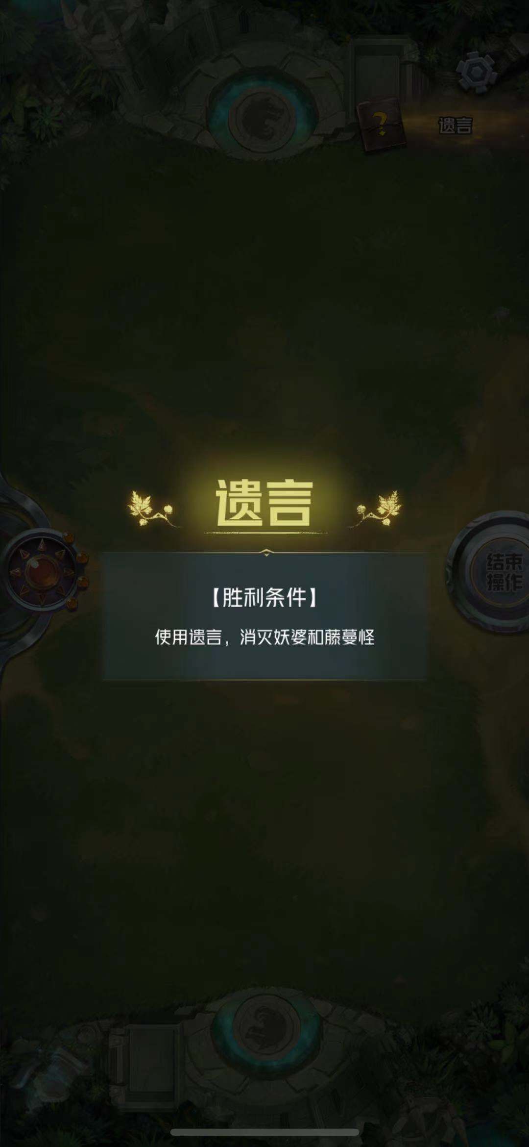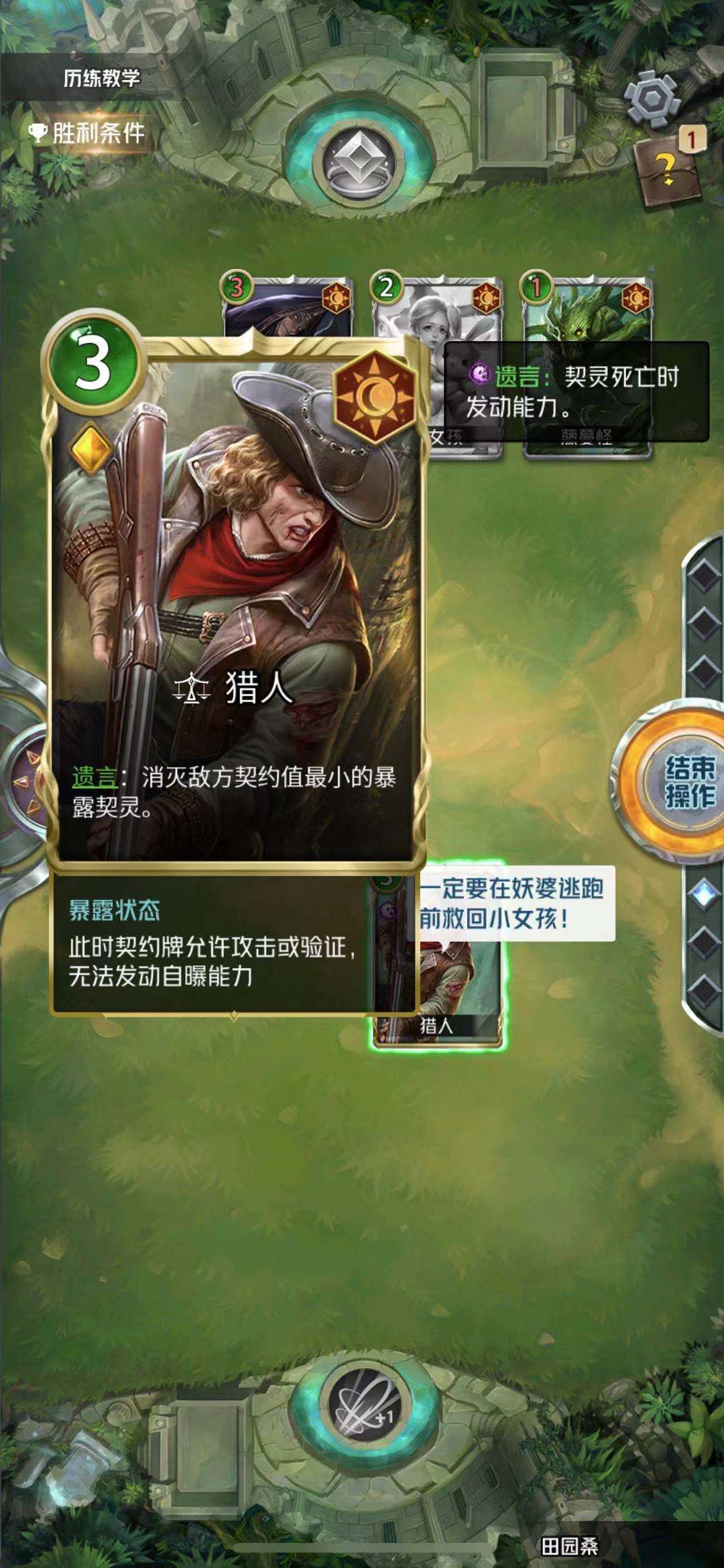 在遗言历练关卡中我们可以看到对手有一个3点契约值的妖婆,一个小仙女一个藤蔓怪,在这里我方具有一个拥有遗言技能的猎人,猎人的功能就是在被消灭的时候可以带走一个契约值最小的暴露契灵,明白这一点之后,我们使用猎人去攻击3点契约值的妖婆,造成猎人被消灭,然后触发遗言技能带走藤蔓怪即可获得游戏胜利。