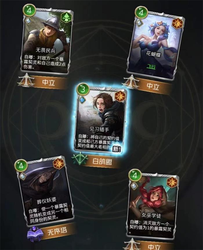五张卡牌随机获得不同阵营和品质,可以获得的阵营有六个,分别是:白鸽盟、黑炮会、圣灵殿、王国、无序塔、潜伏社。也有中立卡牌,每个阵营都可以使用。可以获得的品质有三个:蓝色、紫色、橙色传说。