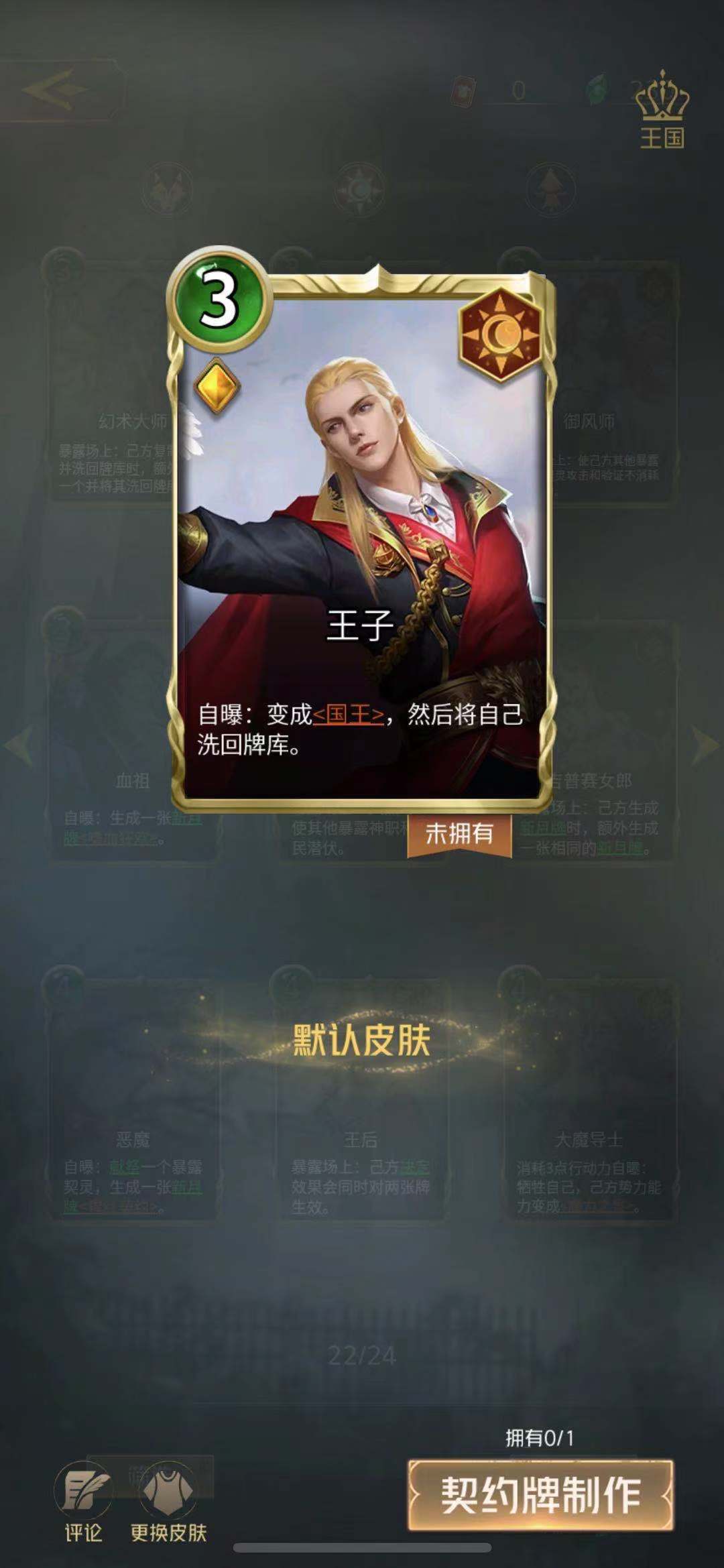 王子是一张传说神职卡,可以在自曝后变成国王,国王具有改变村庄技能的能力,可以把村庄技能改变成召唤,召唤守城盾兵或者守城枪兵,前者拥有护甲可以抵挡一次伤害,后者具有巡逻能力可以防止敌方对我方隐藏牌的探查。